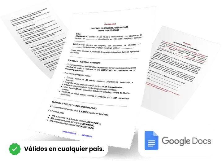 ✅ 20 modelos de contratos listos para usar y 100% editables en Word o Google Docs, adaptados a cualquier tipo de servicio fotográfico.