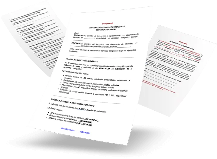 ✅ Contratos diseñados para sesiones de retratos, bodas, eventos, sesiones familiares, comerciales y más, cubriendo todas las necesidades de un fotógrafo profesional.